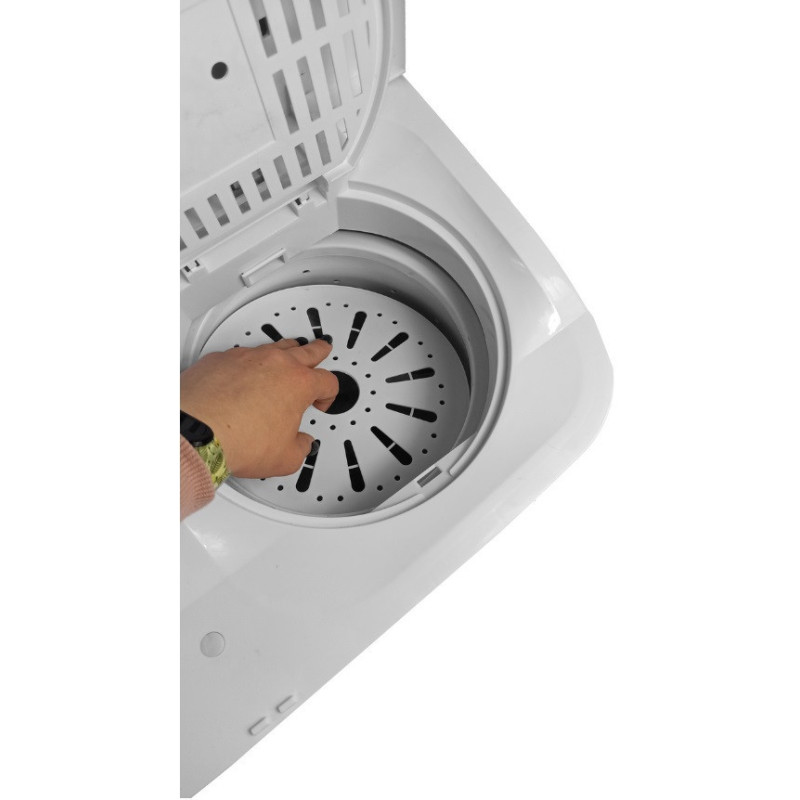 Pralka turystyczna, doskonała na dłuższe wyjazdy z rodziną. Doskonale sprawdza się w domkach letniskowych i kamperach dzięki cichej i wydajnej pracy. Waży jedynie 5,5 kg, może jednak zmieścić do 4 kg ubrań. Posiada także funkcję wirowania, z której można skorzystać po wypraniu ubrań i odprowadzeniu wody.